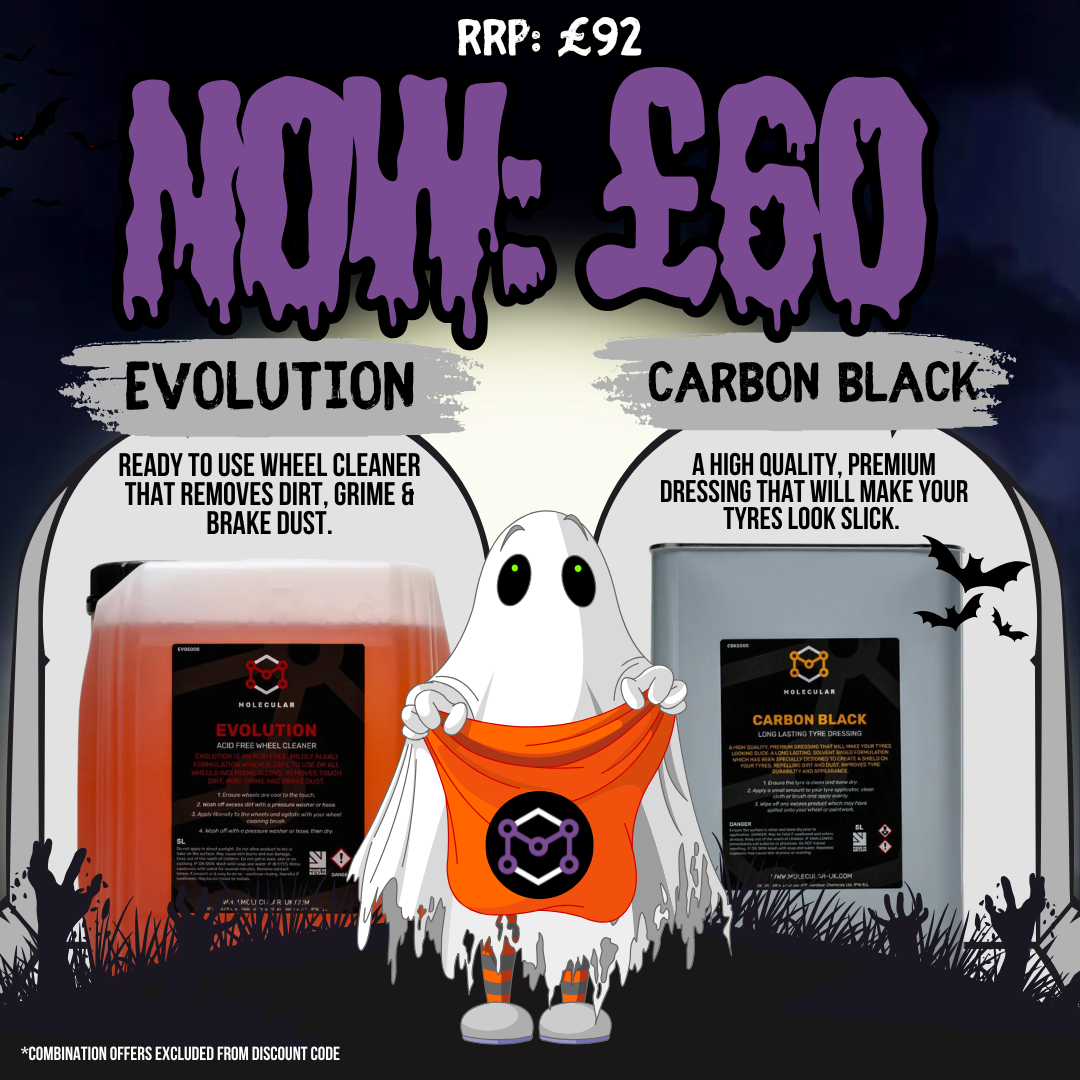 Get great savings with our wheel and tyre combination saver! Included is our easy and ready to use wheel cleaner, EVOLUTION, and our super gloss finish tyre shine, CARBON BLACK. Both are must have products for any car detailer or valeter.