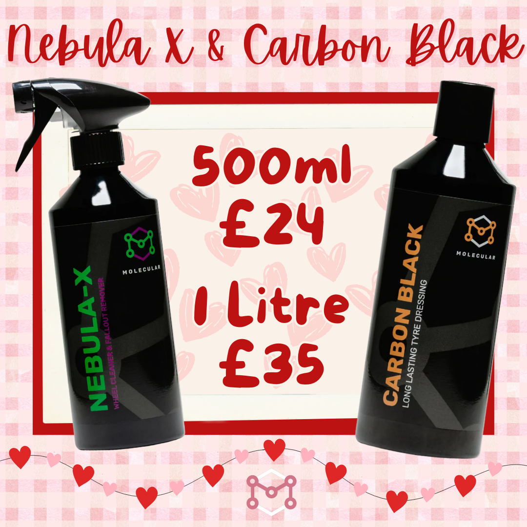 Show your vehicles wheels some love this valentines with our awesome wheel cleaning deal. This cracking deal includes our simple and easy to use Fallout Remover / Wheel Cleaner, NEBULA-X, and our high gloss tyre shine, CARBON BLACK.